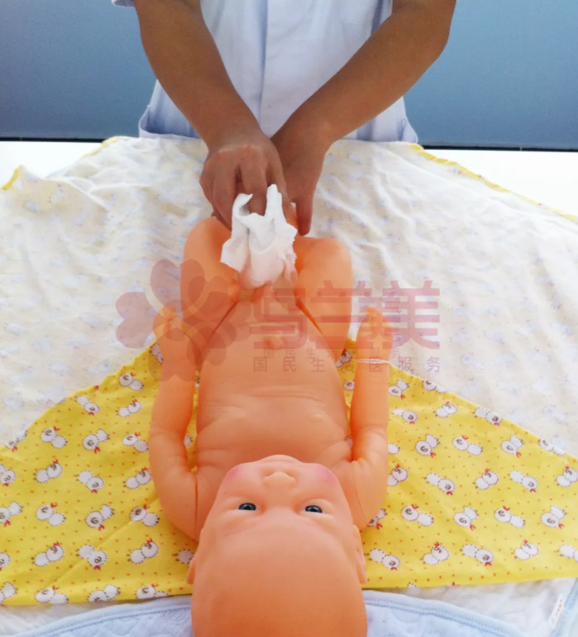第五步:脫紙尿褲:輕輕解開(kāi)兩側(cè)腰貼,提起寶寶腳部,抓住紙尿褲向內(nèi)折疊取出。