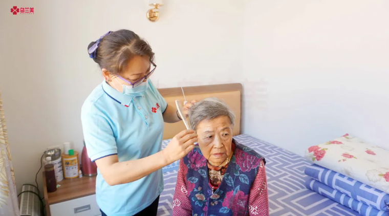 △烏蘭美養(yǎng)老護(hù)理員楊麗鮮正在為史玉玲奶奶梳頭